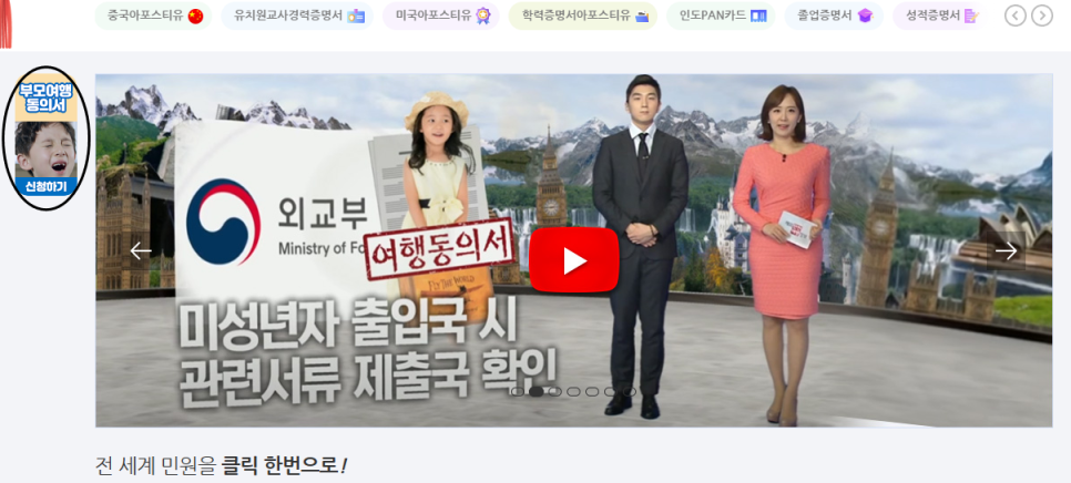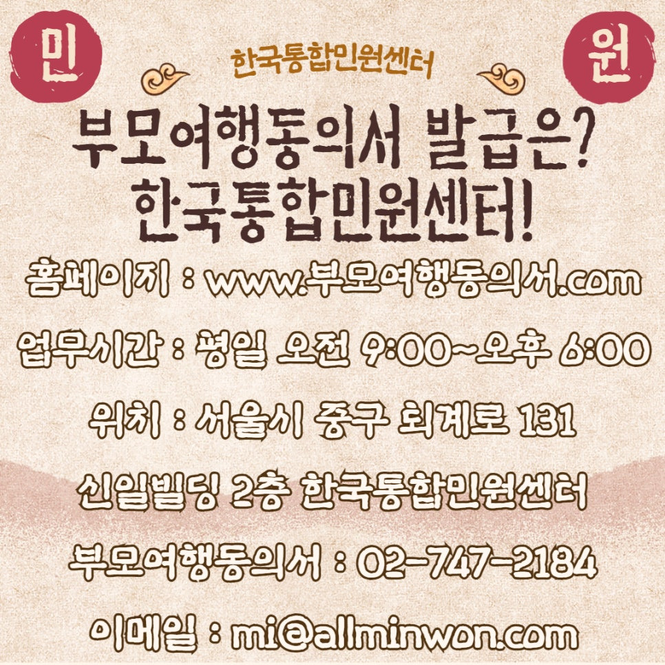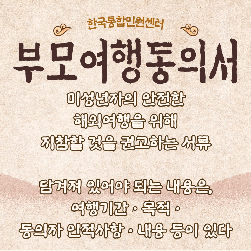저희 한국통합민원센터에서는 부모여행동의서 작성, 번역공증,