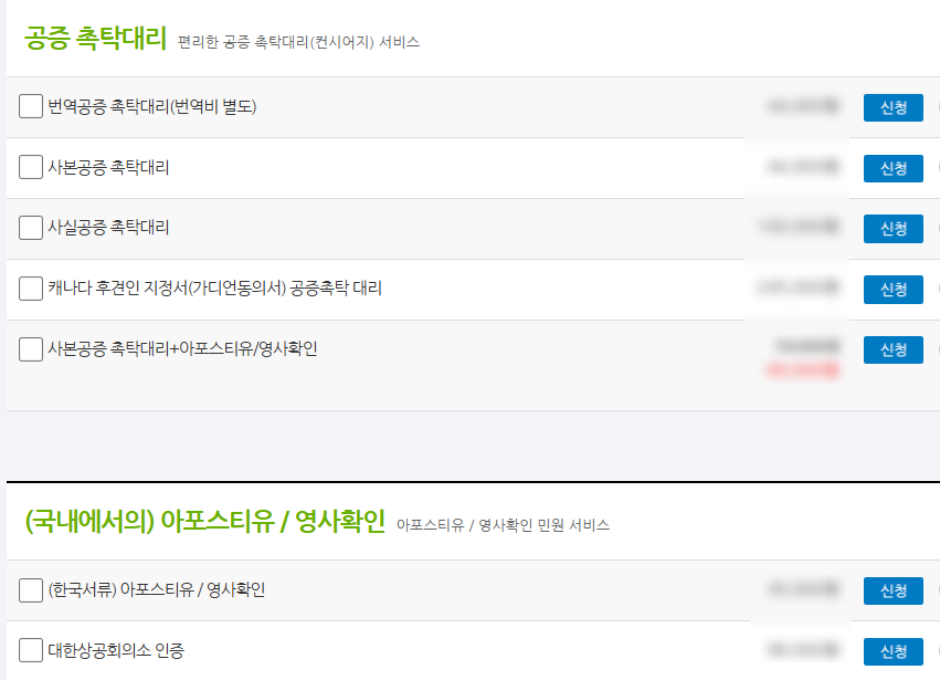 번역, 공증촉탁대행, 영사확인/아포스티유, 대사관인증 모두 별도의 상품입니다