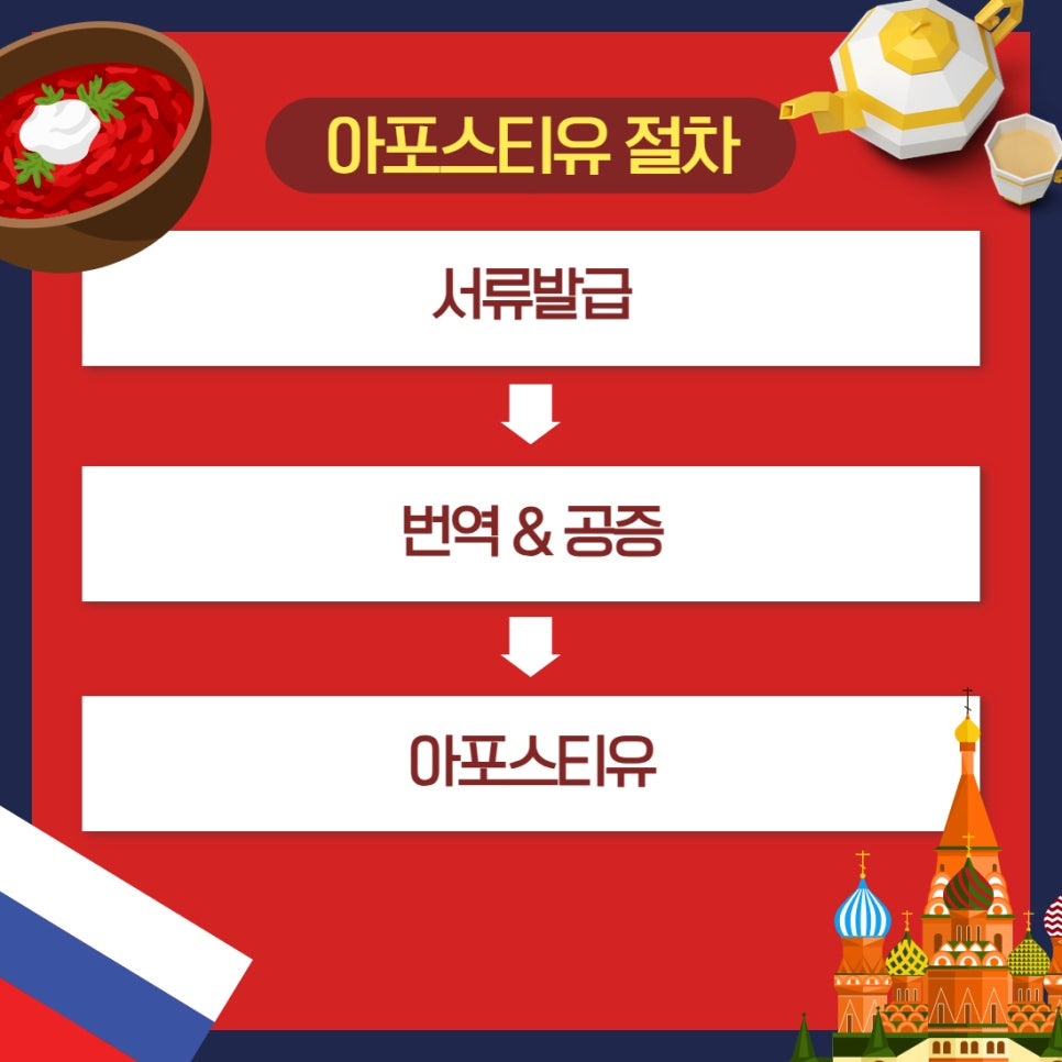 3. 아포스티유: 러시아 발급 서류(또는 공증본)에 아포스티유를 받아 국제 인증을 완성해요.