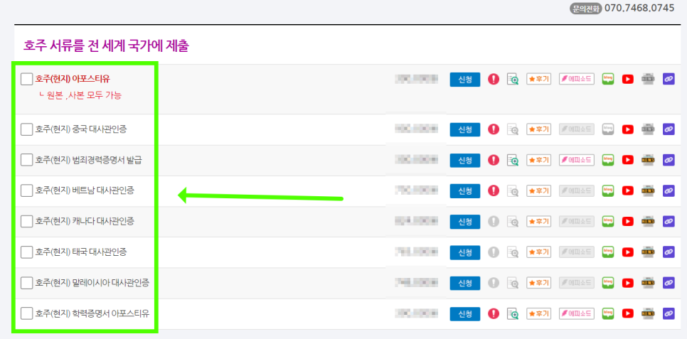 3. 국가로 상품 검색에서 '호주' 선택 -> 필요한 서류에 따라 옵션 확인 후 담기