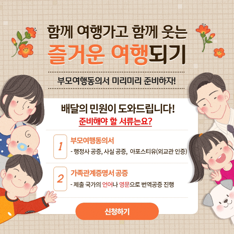 답은 YES! 바로 배달의민원과 함께라면 '부모 여행 동의서'를 아주 쉽고 간편하게 준비하실수 있답니다!! 배달의 민원과 함께 편리하고 즐거운 여행 보내세요!!