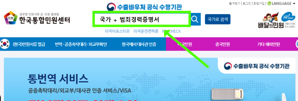 2. 상단 검색창에 '국가 + 범죄경력증명서' 검색