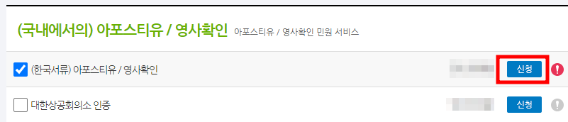 4) 밑으로 스크롤해서 (한국서류) 아포스티유/영사확인을 찾아 신청한다.