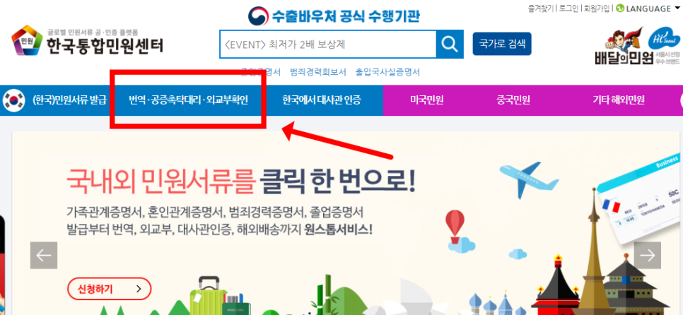 2. 상단 메뉴에서 [번역 공증촉탁대리 외교부 확인] 클릭.