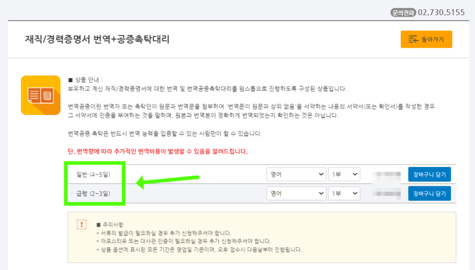 4. 번역 언어를 확인하시고 장바구니 담기 클릭.