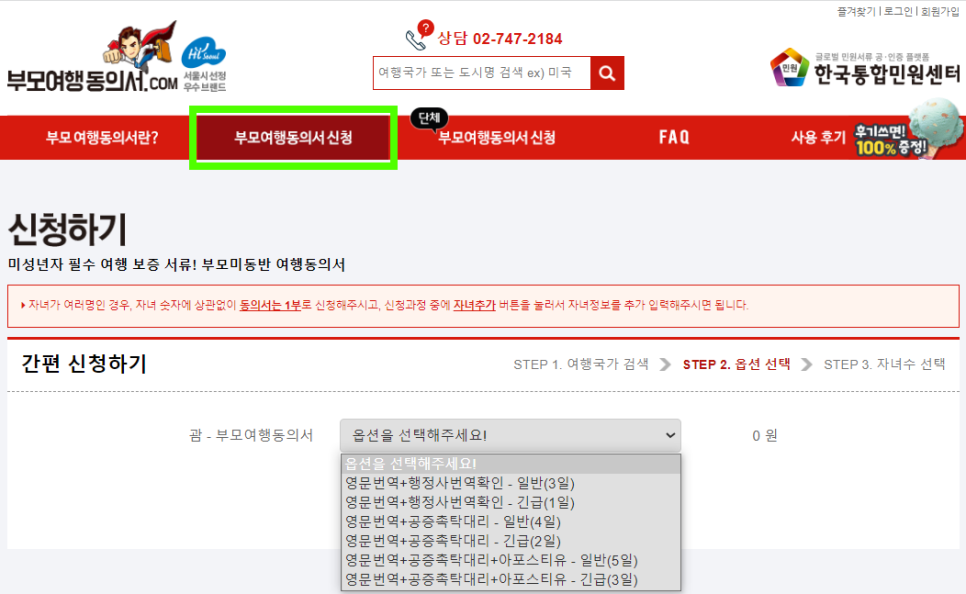 부모여행동의서 신청 ➡ 괌 입력 후 옵션과 자녀 수를 선택해 결제해주세요.