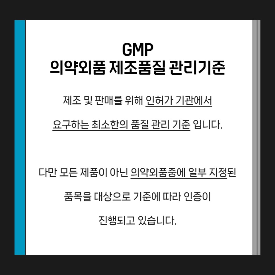 그리고 마지막으로는 GMP, 의약외품 제조품질 관리기준입니다